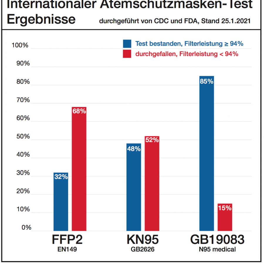Ganz egal was, Hauptsache irgendein Schutz für das medizinische Personal. Die amerikanischen Behörden haben deshalb schon im März gesagt: wenn wir hier schon alle möglichen Masken nach allen möglichen internationalen Standards einkaufen, dann lasst uns doch mal prüfen, was diese Masken taugen. Also haben sie die Masken getestet und die Ergebnisse veröffentlicht.